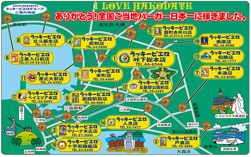 ラッキーピエロ 函館駅前店今までにない紺色を基調にした店作りに、天井や壁一面にアールデコ調のポスターでおしゃれに店内を演出しています。 JR函館… 住所/函館市若松町8-8 電話番号/0138-26-8801 |